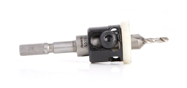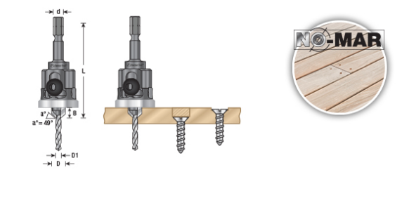 These tools combine carbide countersink, high-speed-steel drill bit and free-spinning, low friction depth-stop. The countersink leaves a clean hole edge and the adjustable depth-stop doesn’t mar the surface. The large openings around the collar allow the chips to clear effectively and eliminate clogging.