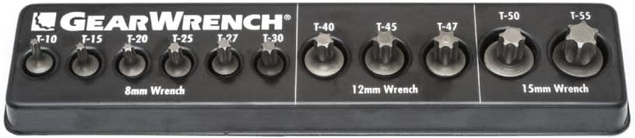 Gearwrench 81560 11 Piece Torx Ratcheting Wrench Insert Bit Set is designed to provide access to fasteners in tight spaces with ease. The insert bits fit securely in 8mm, 12mm, or 15mm 6 and 12 point box end wrenches, whether static or ratcheting. This set includes sizes T10, T15, T20, T25, T27, T30, T40, T45, T47, T50, and T55, all housed in a convenient storage tray. The insert bits are made for high-performance use, with a zinc phosphate coating for corrosion resistance and a ball detent that securely holds each bit in place.