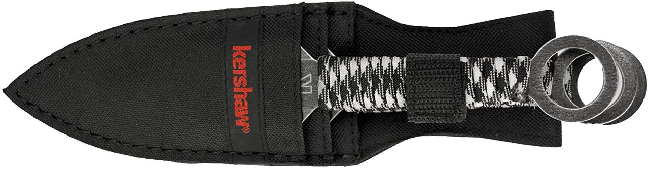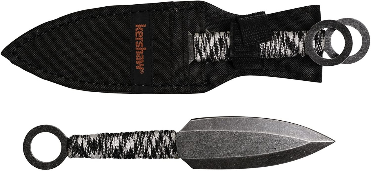 You can’t throw just any knife. You need specially designed throwing knives. The Kershaw Ion set has the correct weight and balance for successful target throwing. Kershaw’s Ion knives are double-edged, spear-point blades. We made these full-tang knives from sturdy, high-chromium stainless steel and wrapped the handles in durable, sure-grip paracord. The extra-wide ring at the end adds balance, offers a great place to attach a lanyard, and makes it easy to remove the knives from the sheath—or from the target.