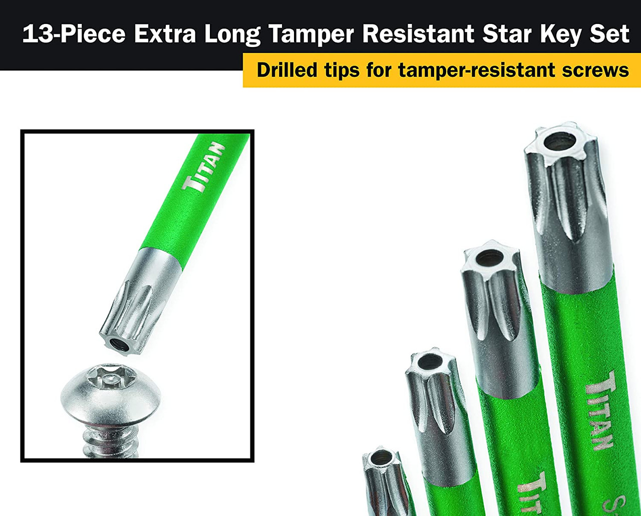 13 Piece Xtra Long TORX Key Set. Sizes: T6 to T50. GREEN Grips. Color coded comfort grips & locking holders. Hex keys have ball-ends to help access in tight areas.